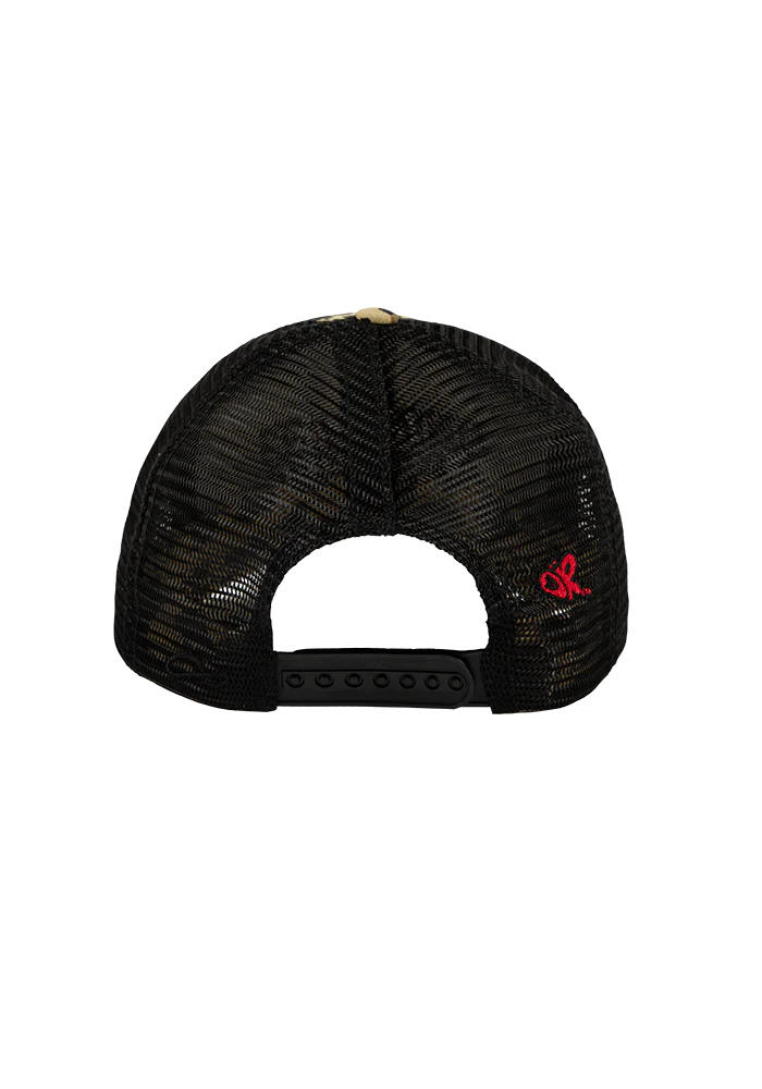 leopard print trucker hat with ponytail opening featuring olivia rodrigo "built like a mother" embroidered graphic