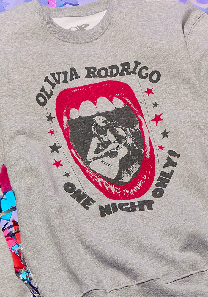 athletic heather grey unisex pullover boxy crewneck featuring olivia rodrigo "one night only!" screen-printed graphic and stars on both sleeves