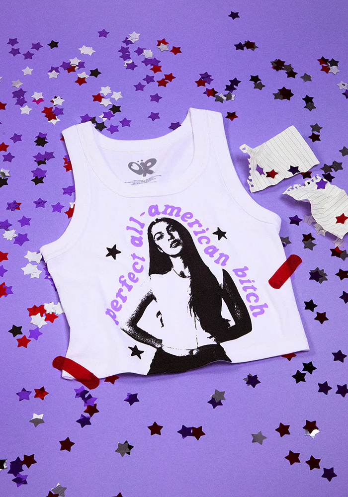white baby rib crop tank featuring olivia rodrigo “perfect all-american bitch” screen printed graphic