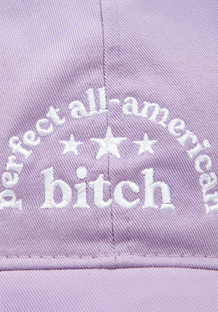 purple unisex dad hat featuring olivia rodrigo “perfect all-american bitch” embroidery on front and “olivia rodrigo” embroidered on back